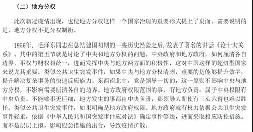 陈剑先生一上来就声明了“地方分权不是分权制衡”,然后引用了毛主席《论十大关系》中“中央和地方分权”的观点,写道:“地方政府权限范围的事,有地方负责;属于中央权限有中央负责。不能够事无巨细,地方发生的事都由中央负责,那领导人即使有三头六臂也难以胜任。类似公共卫生突发事件,如果明确是地方政府权限。地方政府就有权力依据公共卫生突发事件轻重,依据《中华人民共和国突发事件应对法》确定事件等级,进而采取相应防控措施,而不是层层上报,影响应急措施的出台,导致疫情扩散。”