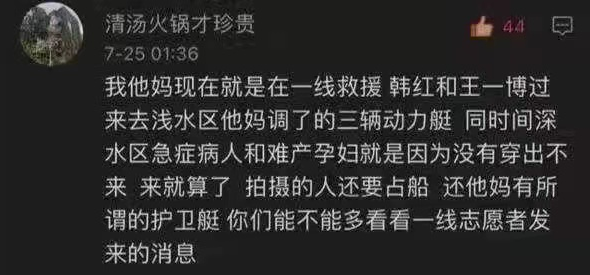 “我TM现在就是在一线救援,韩红和王一博过来去浅水区TM调了三辆动力艇,同时间深水区的急症病人和难产孕妇因为没有船出不来,来就算了,拍摄的人还要占船,还TM有所谓的护卫艇,你们能不能看看一线志愿者发来的消息?”
