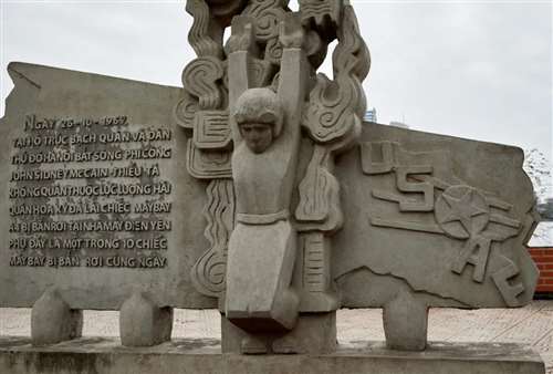 这个地方后来立起了一块石碑,上面刻有麦凯恩屈膝投降的浮雕以及越南军民抓获他的经过。