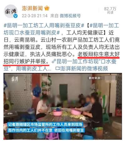 接群众举报,云山村一农副产品加工坊工人们竟然用嘴剥蚕豆皮,市场监督管理局的执法人员随即前往调查。