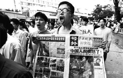 游行人群高举着“血债血还”等旗帜,聚集于美国大使馆门前,时任美国驻华大使尚慕杰在内的十几个使馆工作人员被吓得躲在一座楼房里,直至1999年5月12日才首次走出大使馆。