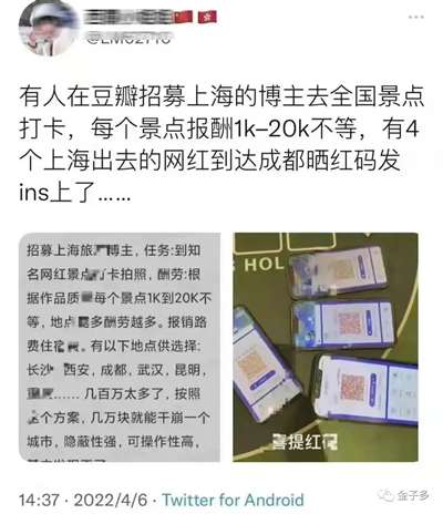 魔都疫情外溢,早有人在网上出资招募魔都旅行博主到全国网红景点打卡。