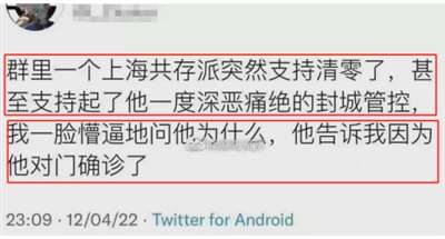 转变的不是一个两个。有人说,“群里一个‘共存派’突然支持清零了,甚至支持起了他一度深恶痛绝的封城管控,我一脸懵逼地问他为什么,他告诉我因为他对门确诊了”。