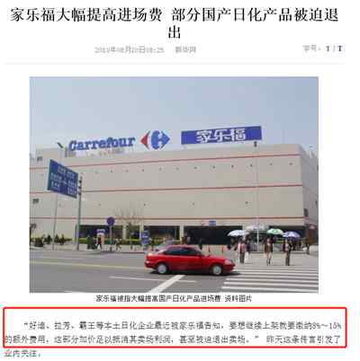 根据中国新闻网的报道,家乐福会向一些品牌收取“进场费”,包括法国节日店庆费、中国节庆费、新店开张费、老店翻新费、DM海报费,名目多达18种。