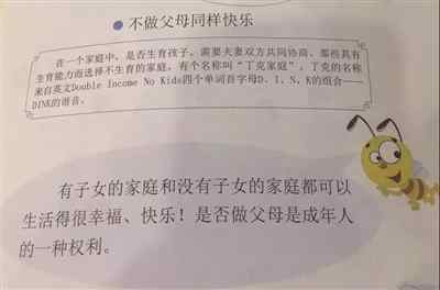 这套性教育读本不仅仅赤裸裸给11—12岁左右的孩子宣扬灌输性解放观念,还给孩子们宣扬非异性恋、不婚主义、不生孩子、不做父母等丁克思想。