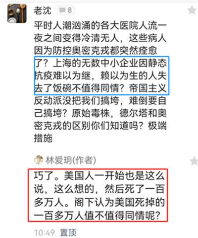 别说上海远没有公知说的那么凄惨,退一步讲,就算真有很多人丢掉饭碗吧,难道丢掉饭碗比丢掉性命还要可怕吗?在我质疑下,“老沈”闭嘴了,闭嘴就对了,至少说明他良心未泯,还有转变的可能性。