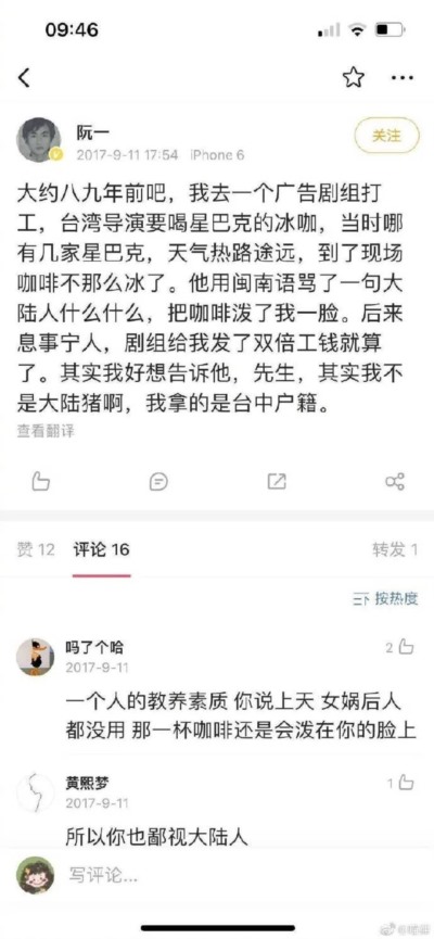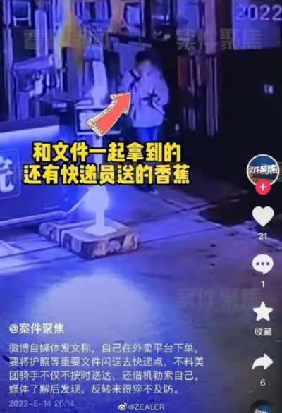 在上海有个叫阮一的台蛙,他找美团小哥送东西,美团小哥不但把东西给他了,还多送他一个香蕉,他吃了美团小哥的香蕉后,竟然在微博上写小作文诬陷美团小哥敲诈勒索,幸好,有监控视频证明了美团小哥的清白,不然的话,美团小哥跳进黄河也洗不清。有网友发微博表示,写小作文的台蛙阮一已经被警察带走调查了,其实,他上一次造谣就该被抓了,这一次都抓晚了,希望能看到一个蓝底白字的警方通报。
