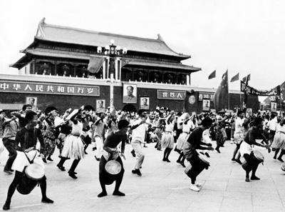 (图为1967年6月首都青年在天安门前表演非洲舞蹈,欢迎卡翁达总统)