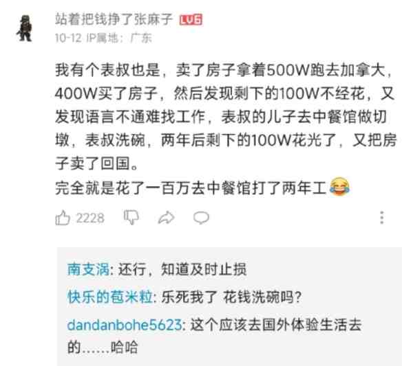 下面这个最经典,拿着卖房的500万RUN去了加拿大,其中400万买了房子,剩下的一百年不够一家人花,然后因为语言不通还不好找工作,最后他和儿子两人就只能去中餐馆洗碗。RUN了两年把剩下的一百万花完后,又把房子卖了回国了。RUN人的亲友嘲笑RUN人说:完全就是花了一百万去中餐馆(不要钱)打了两年(义)工。