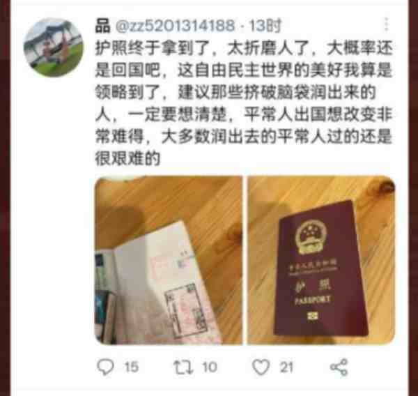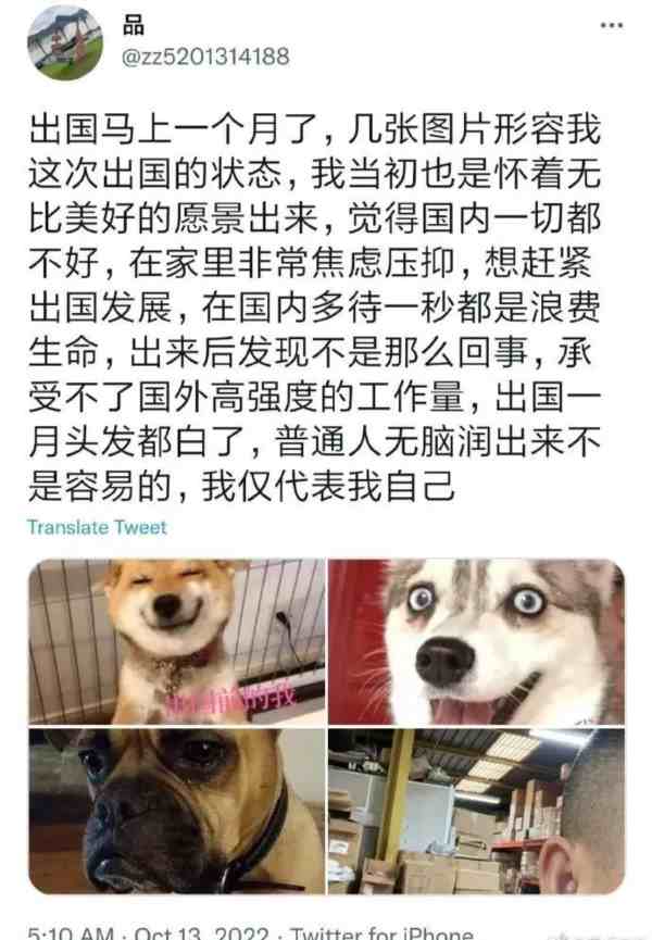 还有一个RUN人,出国即将一个月后在推特上发帖感叹,称他觉得国内一切都不好,他是怀着无比美好的愿景出国,觉得在国内多待一秒都是浪费生命。可是出国之后却发现不是那么回事,他根本就承受不了国外的高强度工作,出国不到一月,头发都白了。所以他感叹说:普通人无脑润出来不容易!