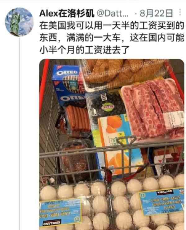 进入美国一个月后,该RUN人打了一份工,去超市购物后发帖称他在美国一天半的工资买一大车,在国内小半个月的工资进去了。