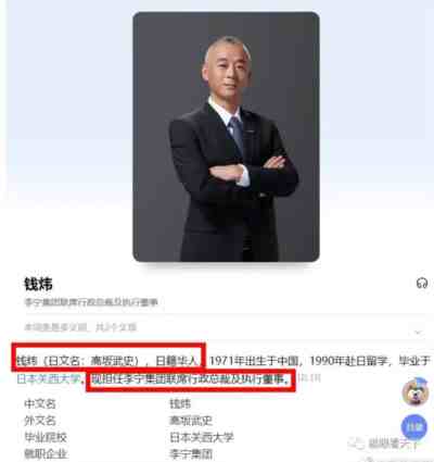 实事求是说,李宁确实可以称得上是中国体坛一位爱国典范,而以他的名字命名的公司也始终以爱国作为形象,激励着无数中华儿女为振兴中国而拼搏奋斗,所以包括老猫在内的很多网友都一直以为李宁就是国产精品的代名词,网上几乎所有的李宁宣传用语也都是中国李宁,然而,为何这样的品牌居然出现如此大煞风景的设计服装呢?究竟是什么人设计出这种鬼子风情的服装?从网上大量的资料不难看出,在李宁高层,有着这么一个鬼才。日籍华人,李宁集团联席行政总裁、执行董事钱某炜。