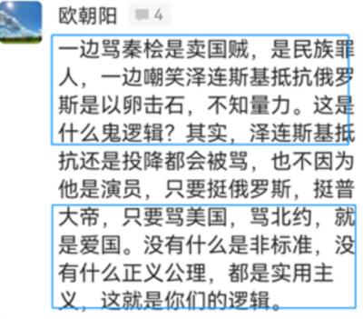 唉,现在的网络真的是一言难尽,前两天还有人大放厥词,说什么“一边骂秦桧是卖国贼,一边嘲笑泽连斯基抵抗俄罗斯是以卵击石。这是什么鬼逻辑?”我真的是懒得反驳了,只想请此人扪心自问下,泽连斯基抵抗俄罗斯是为了乌克兰人吗?一个美国的提线木偶,他何德何能能扛起乌克兰民族大义的大旗?