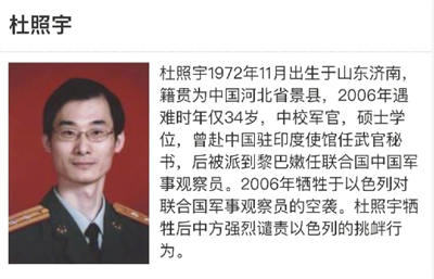第一、黎巴嫩时间2006年7月25日,以色列无视多次警告,执意用航空炸弹将联合国停战监督组织军事观察员、我国国防部参谋杜照宇炸死在哨所内,年仅33岁。