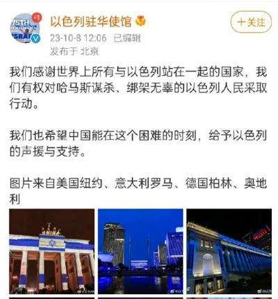 第一条,以色列驻华使馆以因为“美国、意大利、德国、奥地利等国支持以色列”,所以“希望中国能在这个困难的时刻站出来给予以色列声援与支持”。