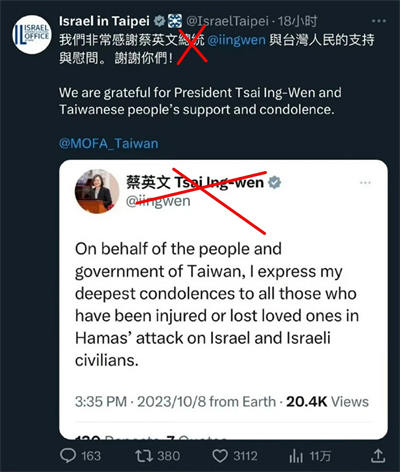 就在今天上午,以色列的官方外交机构在某社交媒体平台上公然称呼蔡英文为“总统”,在事实上、在国际上公然制造“两个中国”、“一中一台”,实质性的实施了分裂中国的罪行。