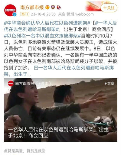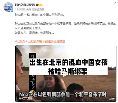第二条,以色列驻华使馆发贴,再玩儿道德绑架伎俩,声称被哈马斯俘虏的女孩Noa 是在北京出生的混血,说她是中国人的“女儿、姐妹、朋友”。