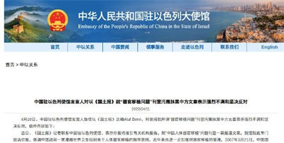 比如2022年4月11日,我驻以色列大使馆发布声明对以色列《国土报》再次污蔑抹黑我国新疆表示强烈不满和坚决反对。