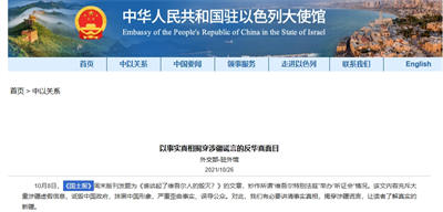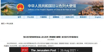 比如2021年8月26日,我驻以色列大使馆发布声明强烈谴责以色列《耶路撒冷邮报》散布涉华错误言论。