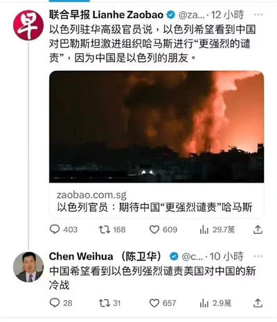 对于此番言论,陈卫华来了一个痛快的秒杀:中国希望看到以色列强烈谴责美国对中国的新冷战。