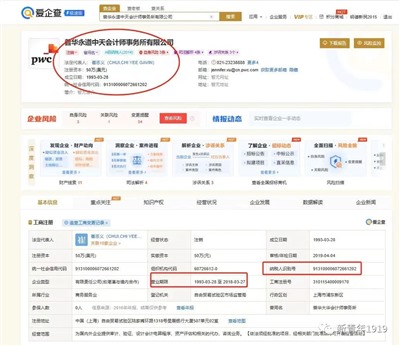 2.我用“普华永道中天”在天眼查、企查查上分别检索,与证件号“913100006072661202”吻合的只有一家名为“普华永道中天会计师事务所有限公司”的主体,该公司法定代表人崔志义。