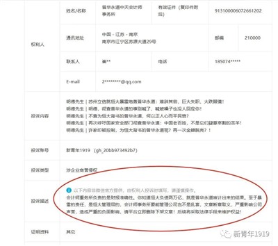 1.我因为质疑普华永道在恒大超2万亿债务暴雷前一直出具无保留意见的审计报告,被普华永道投诉侵犯商誉。下图是我在@腾讯公司 后台收到了普华永道对本人的投诉(见图1),里面的投诉主体是“普华永道中天会计师事务所”,有效证件是“913100006072661202”,联系人“崔**”,qq邮箱。