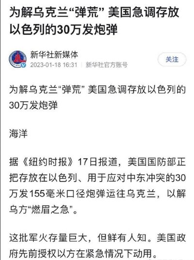 今年元月时,美国为了解决乌克兰的“弹荒”问题,不是曾经从以色列调出30万发155毫米弹药嘛!
