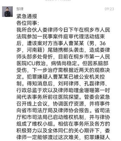 位于杭州的浙江六和律师事务所则发布紧急通报,称受害人系该所合伙人娄律师,在桐乡市人民法院参加一民事案件庭审代理活动结束后,遭该案对方当事人曹某某(男,36岁,河南籍)尾随携榔头袭击,造成娄律师头部多处骨折……
