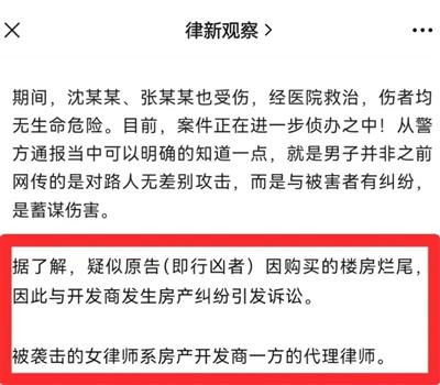 但尽管如此,我们仍能从他们披露的信息之外,得知行凶者疑似购买了烂尾楼房,所以才与开发商产生了购房纠纷、并由此引发了诉讼。而那年轻貌美的律政佳人,正是房地产商的代理律师。