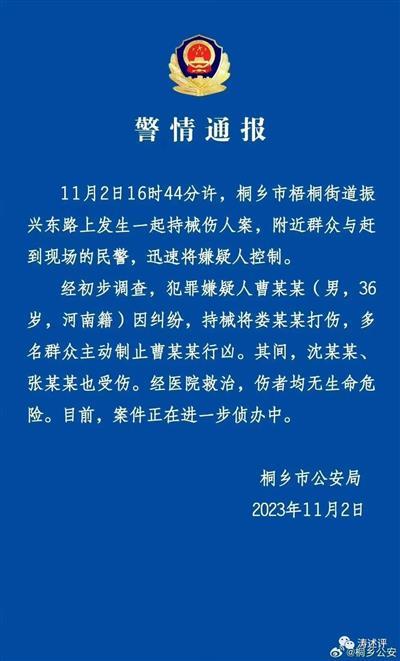 随后,浙江桐乡公安发布的警情通报印证了这一恶性事件。称11月2日16时44分许,桐乡市梧桐街道振兴东路上发生一起持械伤人案,附近群众与赶到现场的民警,迅速将嫌疑人控制……