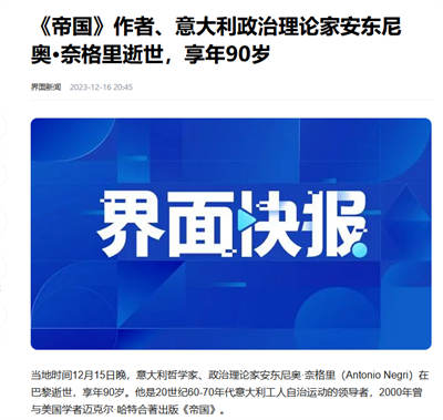 需要注意的是,奈格里虽然是左翼理论家,但他的理论路径并非经典的马列体系,虽然帝国理论同样属于对晚期资本主义与全球化秩序的一种阐释,但奈格里框架中的晚期资本主义和欧洲西马路线学者们对晚期资本主义的阐释还是各有不同。