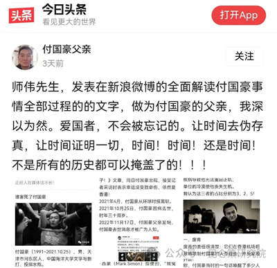 【付国豪父亲】师伟先生,发表在新浪微博的全面解读付国豪事情全部过程的文字,做为付国豪的父亲,我深以为然。爱国者,不会被忘记的。让时间去伪存真,让时间证明一切,时间!时间!还是时间!不是所有的历史都可以掩盖了的!!!