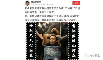 2022年11月17日,付国豪父亲发帖,付国豪去世消息才被广为人知。