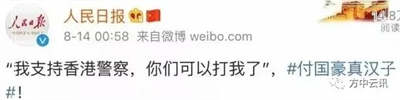 2019年8月13日晚,记者付国豪在香港遭暴徒非法拘禁与殴打,8月14日凌晨人民日报发表人民锐评《付国豪,真汉子!》文章,同日付国豪出院,接受记者采访时表示幸运没受致命伤,依然爱香港!