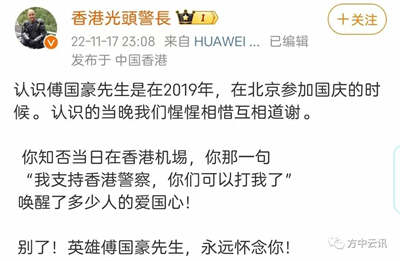 香港当时著名的光头警长后来发微博称,付国豪当时的一句话唤醒了多少人的爱国心,“永远怀念你”!