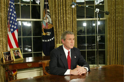 时任美国总统乔治·布什在华盛顿特区的白宫发表讲话,宣布美国军队对伊拉克境内的“可能目标”进行了打击,2003年3月19日。