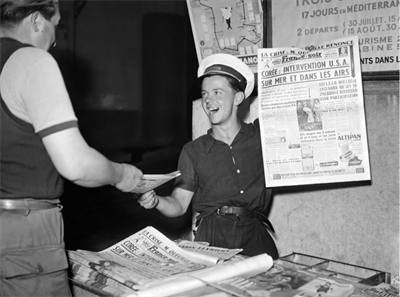 巴黎一名卖报的男子展示报纸头版刊登的美国军事干预朝鲜的消息,1950年6月28日。