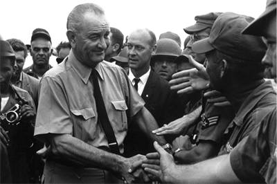 时任美国总统林登·约翰逊在访问越南军队时与士兵握手,1966年。