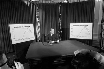 时任美国总统理查德·尼克松在白宫发表电视演讲,宣布将从越南加快撤军,摄于1971年。
