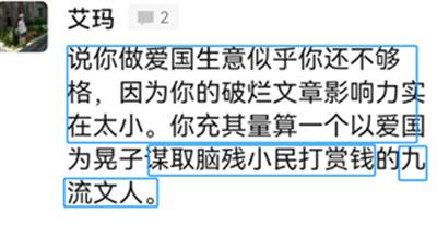 如果只是怼我也就算了,还说我“充其量算一个以爱国为幌子谋取脑残小民打赏钱的九流文人”,这就不能忍了。看我文章的确实都是“小民”,但小民怎么了,小民就不能爱国了吗?对吧,就算他们不够高明吧,但他们有朴素的爱国情怀,总比那些被公知骗了无数遍,还待公知如初恋的恨国耗材要强百倍吧。