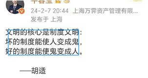 又如有人借胡适的口说,“一个肮脏的社会,如果人人讲规则,而不是谈道德,最终会变成一个有人味的正常社会,道德也会自然回归。一个干净的社会,如果人人都不讲规则,却大谈道德、谈高尚,天天没事就谈道德规范,人人大公无私,那么这个社会最终会堕落成一个伪君子遍地的肮脏社会”。这公知味十足的言论大概率又是公知自编自导然后按在胡适头上的。还是那句话,胡适的人品很烂,但水平多少还是有的,以胡适的水平还不至于把道德和规则割裂开来。先有道德,后有规则,不符合道德的规则是不存在的。如果人人都用道德规范自我约束,那自然人人守规则,怎么可能有人只讲规则,不讲道德呢?
