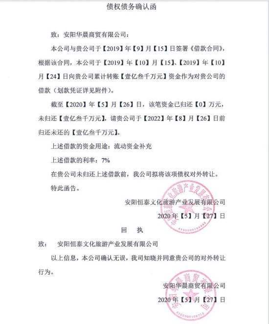 附件3:安阳恒泰文旅国企,发给:安阳华晨商贸国企的:安阳华晨商贸国企借款1.3亿元没有还钱的,债权债务确认函。