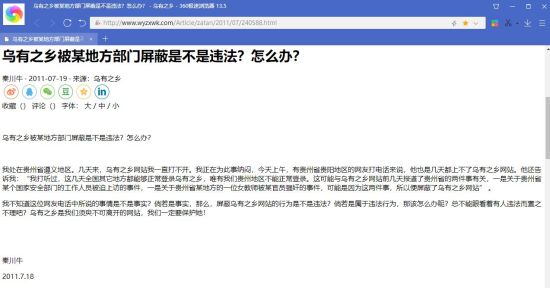 附件6:在2011年,就有贵州网友反馈。疑似因为:北京乌有之乡平台,报导了:疑似某省当地的公职人员的严重违纪的新闻。被那个省份屏蔽了。但是其他省份,可以正常打开:乌有之乡平台网站。这是否属于:用地方权力干预屏蔽:舆论监督?