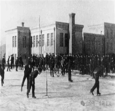 图:按照日本学制举办的日本人学校——大连早苗高等小学校,学生在校园滑冰。