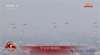 当45架直升机组成空中护旗梯队拉着党旗、国旗和军旗呼啸而来的时候,气氛达到了又一个新的高潮。我也成了个话痨,当起了家庭解说员。