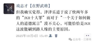 我举个例子:前段时间 “JK罗琳事件”,我在群里、朋友圈跟朋友大战三百回合。这事其实挺复杂的:为什么JK罗琳和艾玛·沃特森吵了这么多年,这次搞这么热闹?很大程度是因为罗琳相关的叙事太符合大家熟悉的 “德育故事”—— 就像 “农夫与蛇” 那种。我读过一篇批判罗琳的文章,分析上也还不错,文章在技术上解释了,这种“农夫与蛇”的故事是主流媒体或反跨媒体用的叙事技巧,但不可否认这种技巧很成功。像南风窗、三联那么大的流量,不全是关注事件本身的人带起来的,更多是来看 “互相扯头花” 的八卦心态。