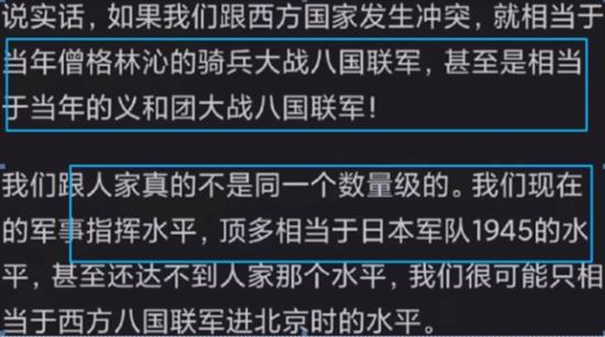 这态度够明显了吧,但还是有公知敢跳出来说什么“我们现在的军事指挥水平,顶多相当于日本军队1945的水平,甚至还达不到人家那个水平,我们很可能只相当于西方八国联军进北京时的水平”。如此唱衰中国,他哪来的脸自称“我们”的,谁和他是“我们”?