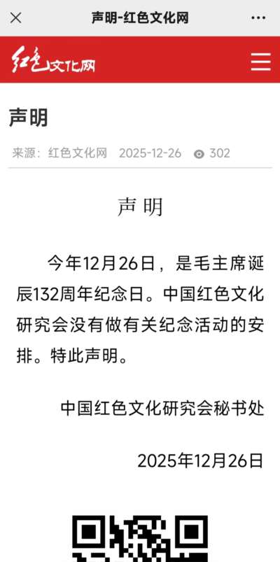 今年12月26日,是毛主席诞辰132周年纪念日。中国红色文化研究会没有做有关纪念活动的安排。特此声明。
