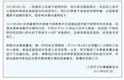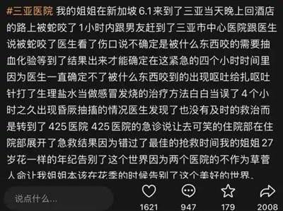 该名女子于2日凌晨0时许步行回酒店途中被不明物咬伤并流血,回酒店简单消毒处理后,于01:05打车到达三亚中心医院。由于医院不能确定被什么品种的蛇咬伤,要求患者抽血化验等结果,结果这一等就拖了4个小时,直到患者情况加重又转至某战区医院,经抢救无效死亡。