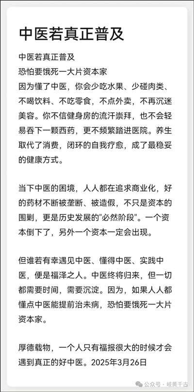 所以,中医的困境,不只是资本的围剿,更是历史发展阶段的“必然失语”。因为它太“干净”、太“自给自足”,它不消费、不依赖、不被驯化,这样的存在,注定让无数利益集团寝食难安。